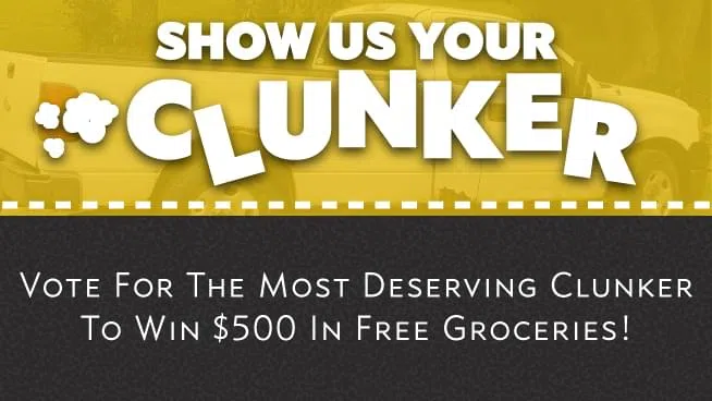 Thank you for sending us a photo of your “Clunker”. The voting is now open through Thursday night. Don’t forget to invite your friends to like your photo on our designated Facebook post. The clunker with the most likes will win $500 in groceries.